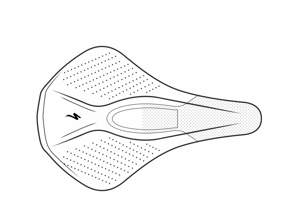 Fig. 6: Specialized Phenom Mirror saddle with soft, stretchy, honeycomb MIMIC feature in the depression in the saddle nose